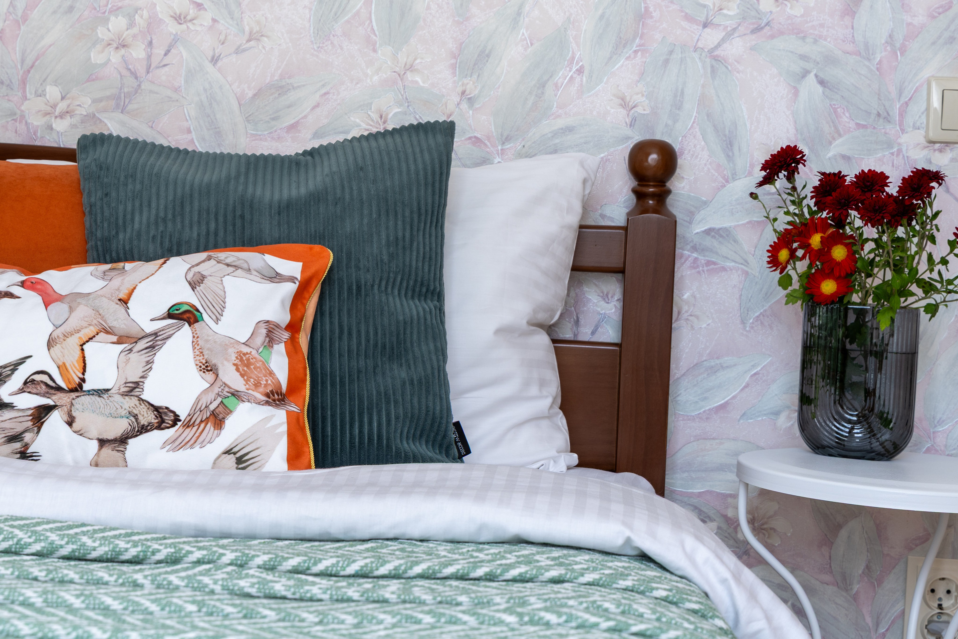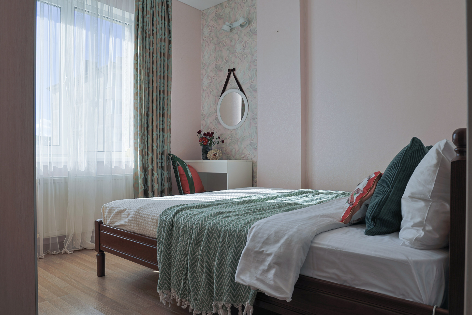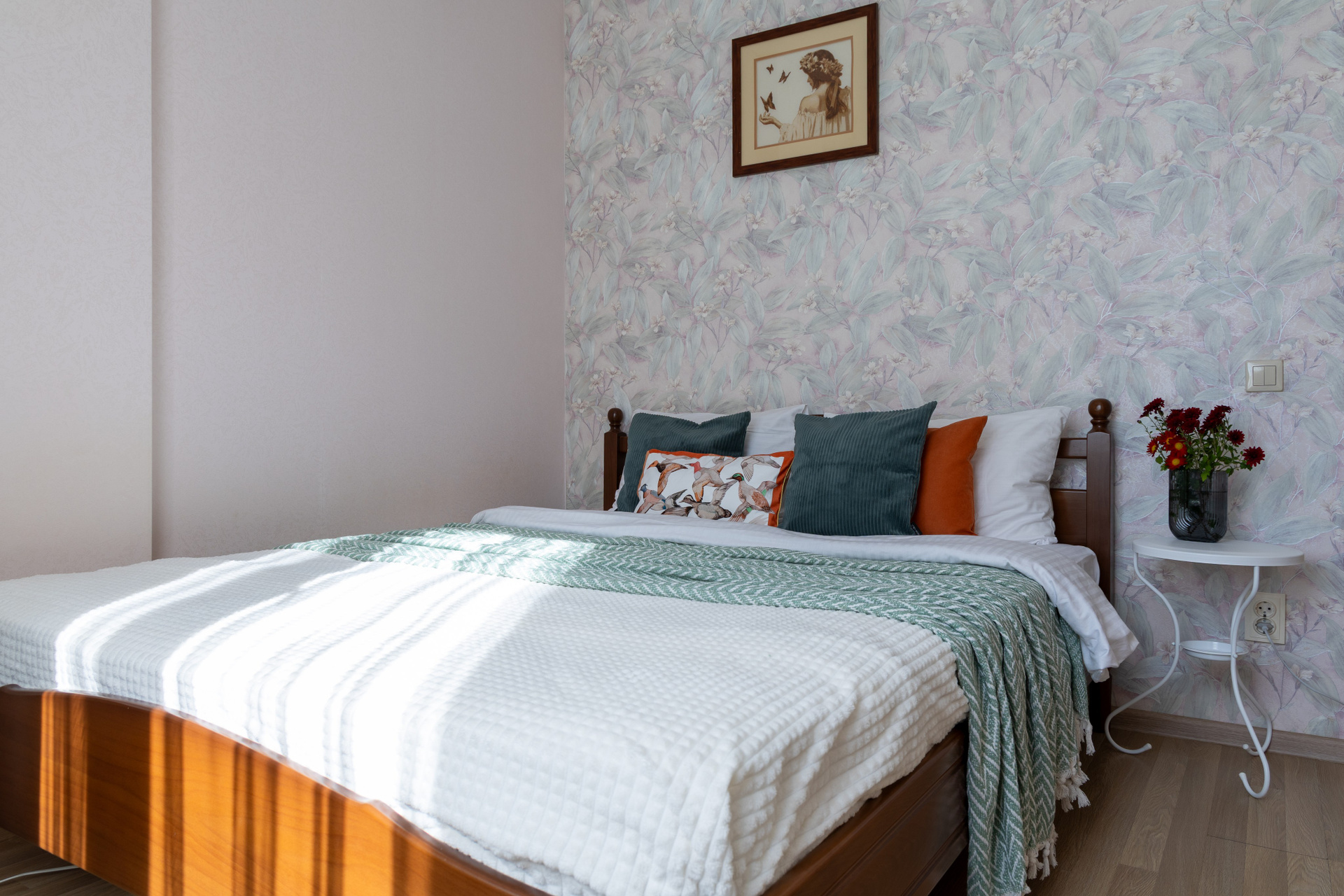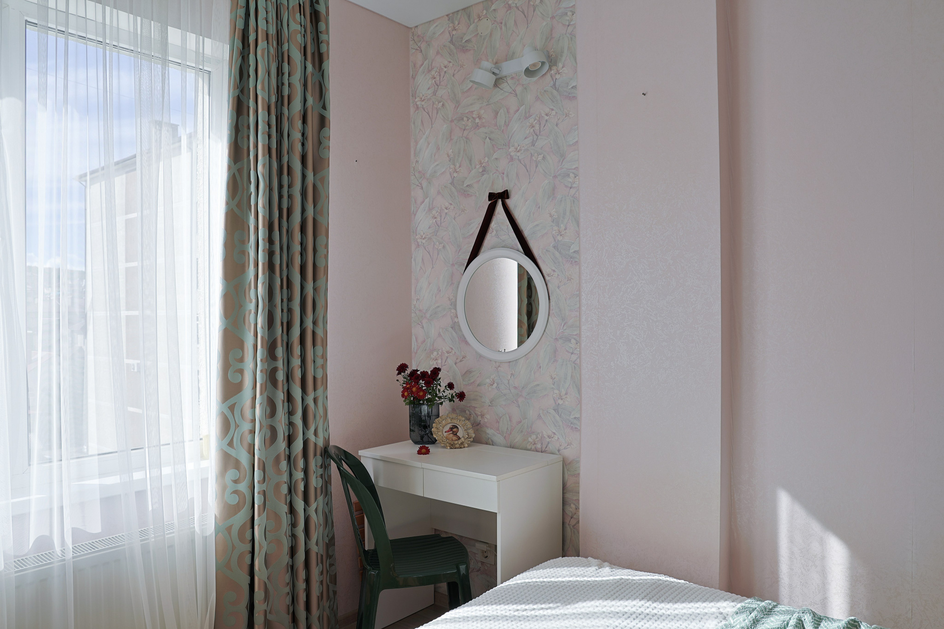 спальня уже имела более мягкую и обновлённую стилистику за счёт новых обоев, поэтому остальную квартиру было важно привести к единому визуальному восприятию — комнату и кухонную зону перекрасили в спокойный нейтральный оттенок, чтобы уравновесить пространство и собрать интерьер в более цельную цветовую концепцию;